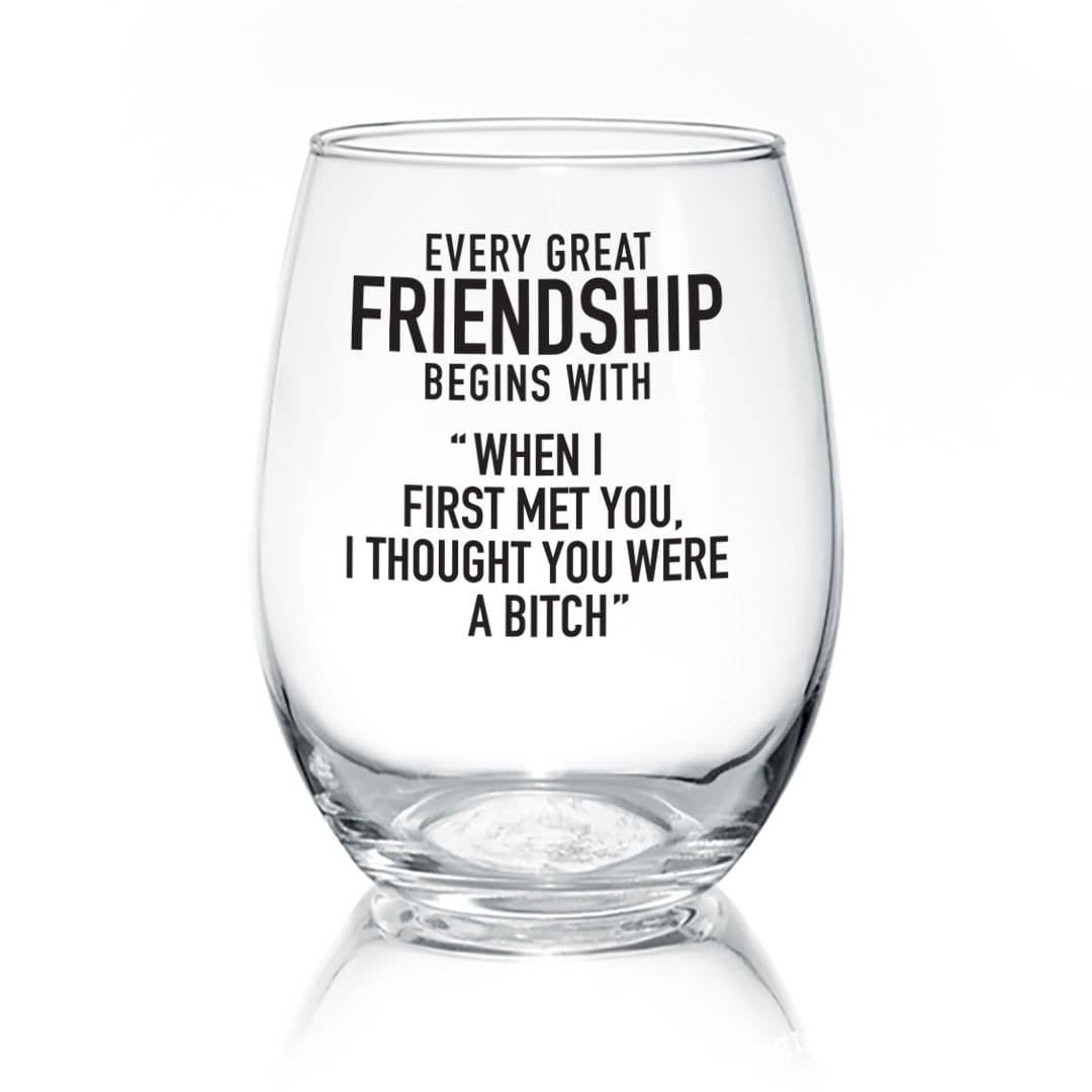 What a better way to sip your favorite vintage! Our Grape Slingers™, aka wine glasses have expressive quotes that make your party filled with laughter. They are a large 17oz (500 ml) glass, big enough for your favorite cocktail as well. Each glass comes in a gift giving box. Measurements are 3.5”w x 4.5”h Top Rack Dishwasher safe!