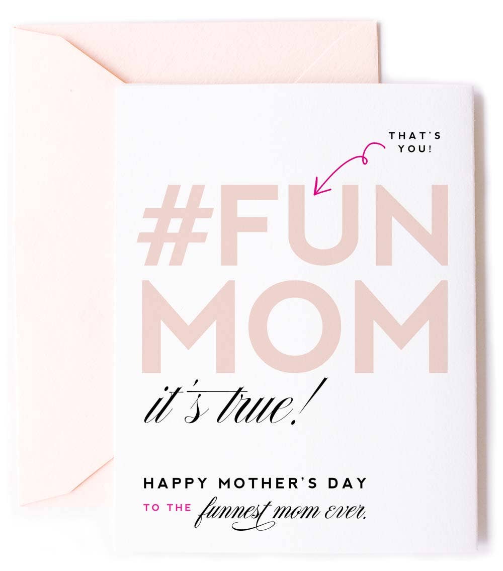 Each SWEET, 4.25" x 5.5" folded greeting card is printed on bright white, thick card stock and comes with a blush A2 envelope. "#FunMom, that's you! It's true! Happy Mother's Day to the funnest mom ever." Blank inside.