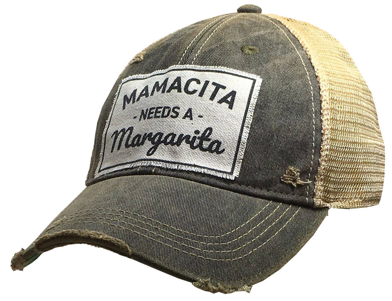 Vintage distressed trucker cap "Mamacita Needs A Margarita" Color: Black distressed Material: cotton/polyester blend, mesh back. Size: one size fits most, with an adjustable snap back strap. Unisex cap.