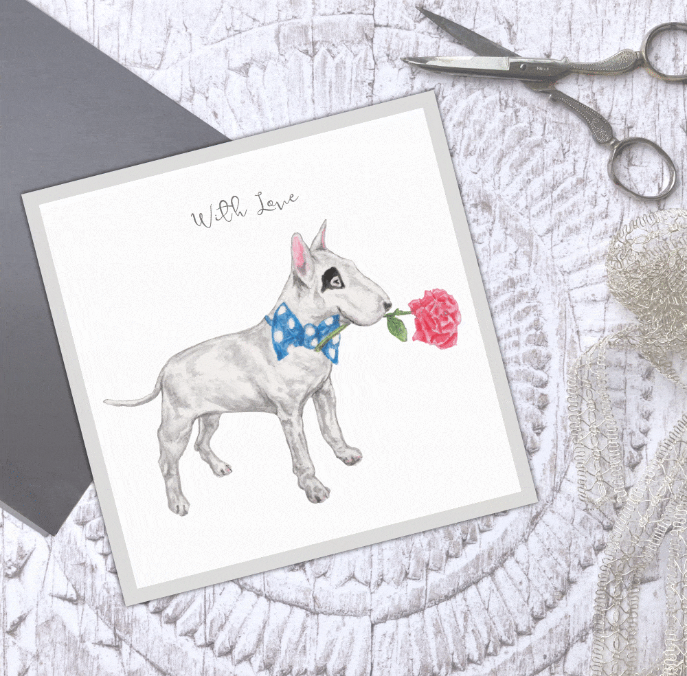 'With Love' caption. This English Bull Terrier dog greeting card was inspired by the characterful dogs Emma meets on walks with her Miniature Dachshund, Nelly. From our Canine Chums collection; perfect for all dog lovers but the focus on character gives it generic appeal too. Printed on luxury, recyclable 350gsm FSC certified diamond white board.